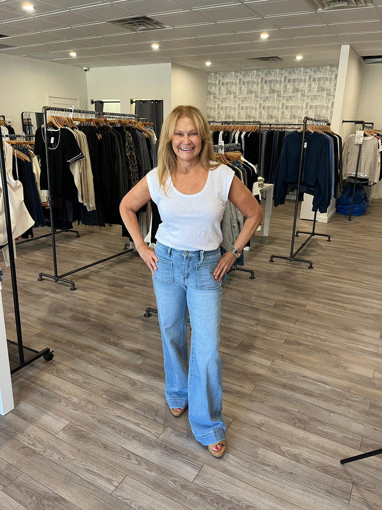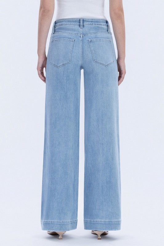 HIGH RISE WIDE TROUSER JEANS. COMFORT STRETCH DENIM. HIGH RISE WAIST, PATCHED POCKET DETAIL, FULL LENGTH, WIDE TROUSER JEANS