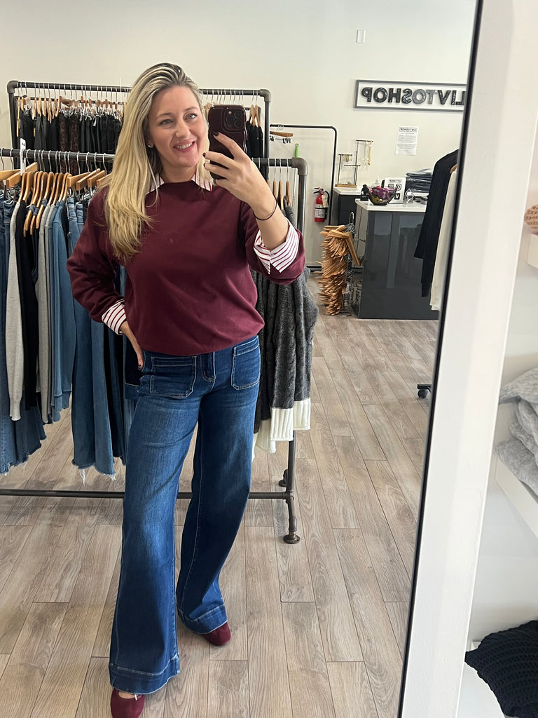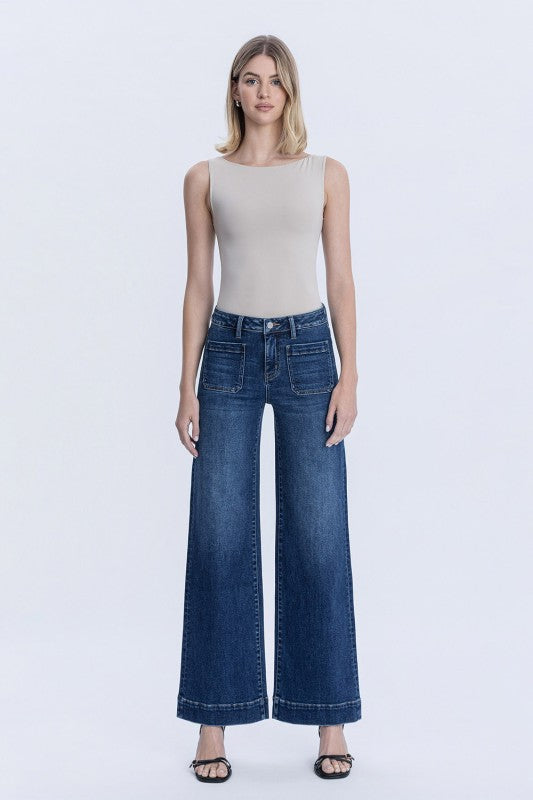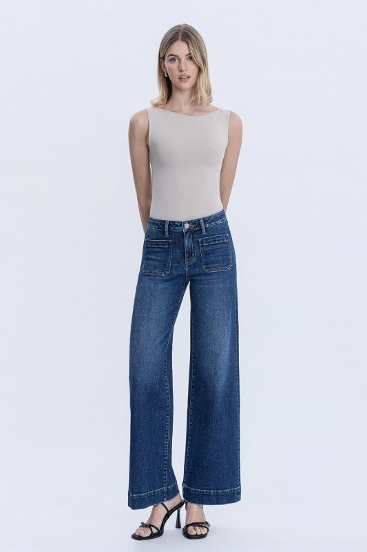HIGH RISE DARK WASH TROUSER WIDE JEANS PATCH POCKET.