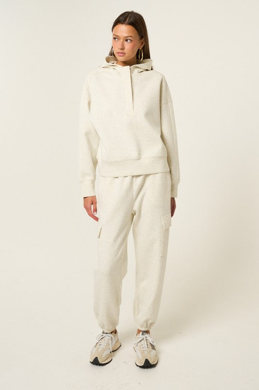 A relaxed fit hoodie crafted from ultra soft fabric for all day comfort. Features a convenient half zip detail and a soft mock neck for added warmth. Perfect for casual wear loungewear or layering.