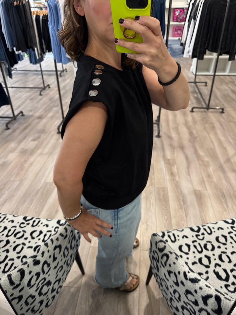 BLACK SLEEVELESS TOP WITH SILVER SNAP DETAIL