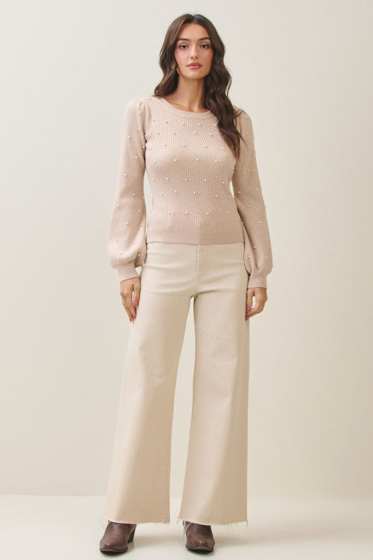 Faux pearl sweater. Embellished knit top. Volume sleeves.