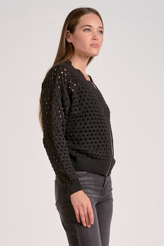 ELAN BLACK OPEN KNIT ZIP CARDIGAN SWEATER
