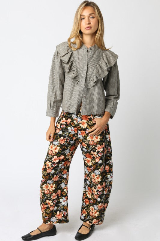 Our Tiana Stripe Ruffle Shirt features a ruffled hem and a button down.
